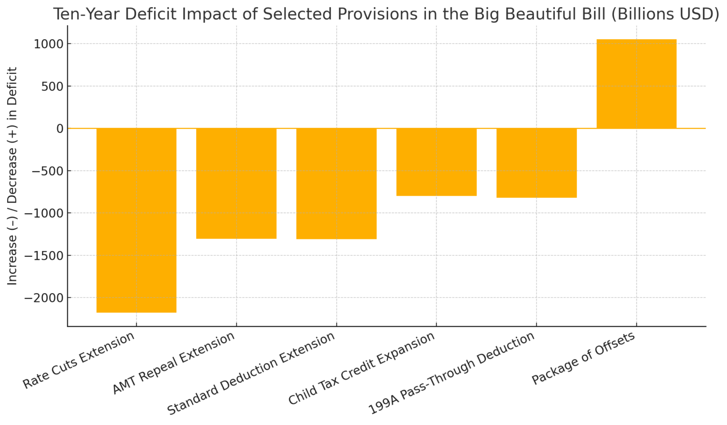 Ever wonder which line items blow the biggest hole in the deficit? The bar chart below stacks the winners and offsets side-by-side so you can see—in vivid color—how extensions of the 2017 tax cuts dwarf the bill’s pay-fors.